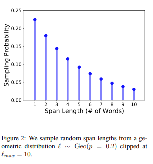 Span의 길이는 geometric distribution(l ∼ Geo(p))에 의해 정해지며, 이는 짧은 span쪽으로 skew되어있다. 이는 아래의 그림을 보면 확인가능하다. 또한, span의 길이는 subword tokens이 아닌 complete word단위가 기준이다.
