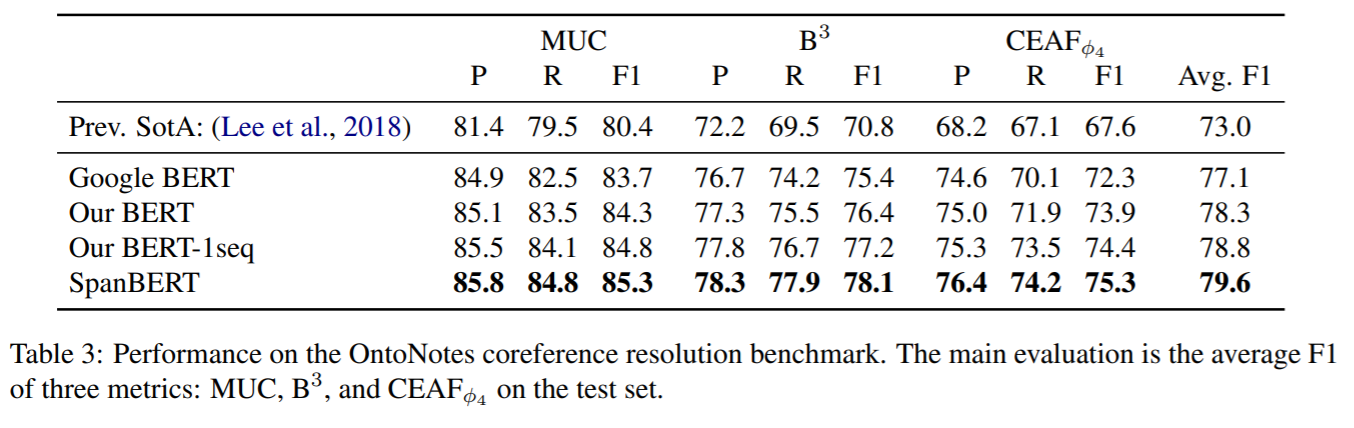 SpanBERT : Improving Pretraining by Representing and Predicting Spans(Mandar Joshi et al, 2020)에서는 동일한 모델에 BERT 대신 SpanBERT를 적용해 coreference resolution을 진행했다. 아래 Table 3는 그 성능을 나타낸다.