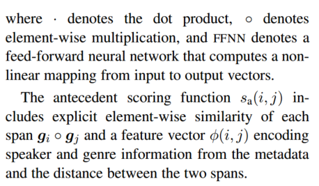 5. Span Ranking Model : pair가 되는 각 span의 mention score들과 pairwise antecedent score를 종합하여 coreference score를 계산한다. 그리고 이를 maximize하도록 학습한다.
