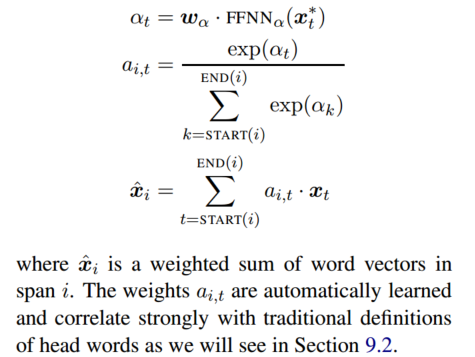 또한 soft head word vector xˆi 와 feature vector φ(i)를 span i의 사이즈로 임베딩한 값도 포함한다.