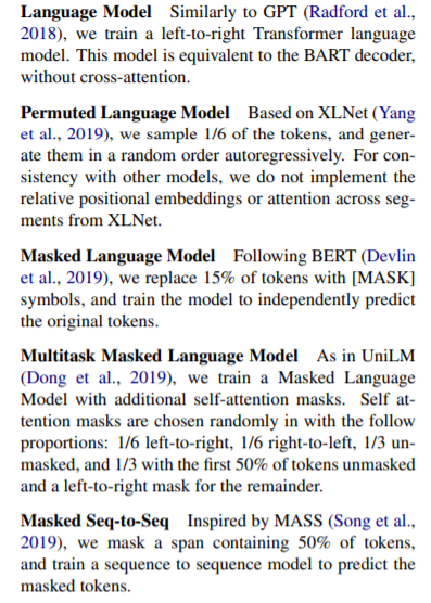 BART는 손상된 text를 입력받아 bidirectional한 encoder로 인코딩하고, 정답에 대한 likelihood를 autoregressive decoder로 계산한다. 따라서 다양한 noising 기법이 이용 가능하다는 장점이 있다. 이 논문에서는 문장 순서를 바꾸거나 임의 길이의 토큰을 하나의 mask로 바꾸는 등의 여러 noising 기법을 활용한다.