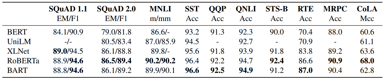 SQuAD, GLUE에 대해 BART 성능을 측정했다. 같은 데이터를 사용해 다른 방법으로 학습한 RoBERTa와 비교해보면 큰 차이가 없음을 보였다. BART는 generation task에서 성능 향상을 이루면서 classification task에서도 경쟁력을 유지했다.