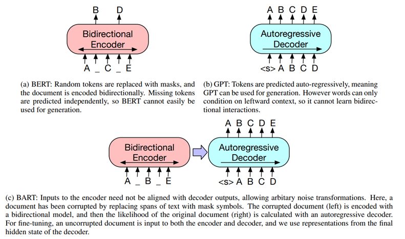 BART는 기존 seq2seq Transformer 기반의 모델이며 GPT처럼 ReLU activation function 대신 GeLU를 이용한다는 점만 다르다.