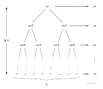 각 층의 계산 시간 : 데이터 개수가 n일 때, 이를 정렬하는 데 cn의 시간이 걸린다고 해보자(c는 컴퓨팅 파워 등과 관계 있는 어떤 상수를 나타냄).